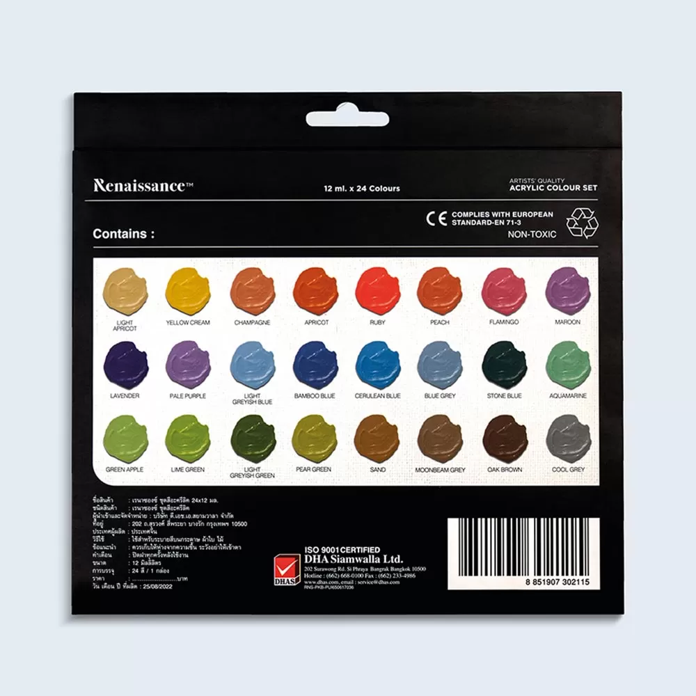 Renaissance akryylimaalit ovat myrkyttömiä ja CE-merkittyjä. Maalit levittyvät helposti ja pigmentti on erittäin peittävää. Maalit ovat vesiohenteisia eli niitä voi halutessaan ohentaa vedellä. Maalit tulevat kätevissä 12 ml tuubeissa. Pese työvälineet sekä kädet lämpimällä vedellä ja saippualla.
