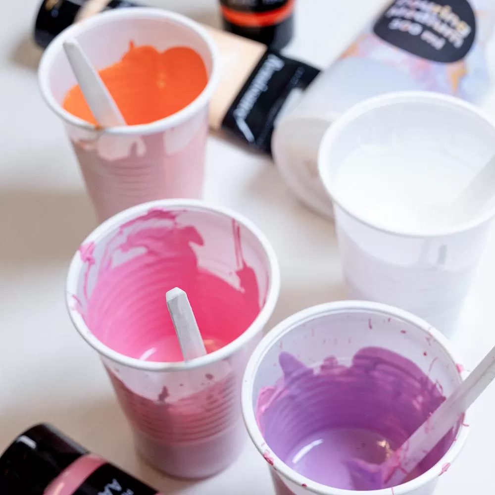 Pouring-tekniikassa akryylimaaleista tehdään juoksevampia ja luodaan helposti abstraktia taidetta.