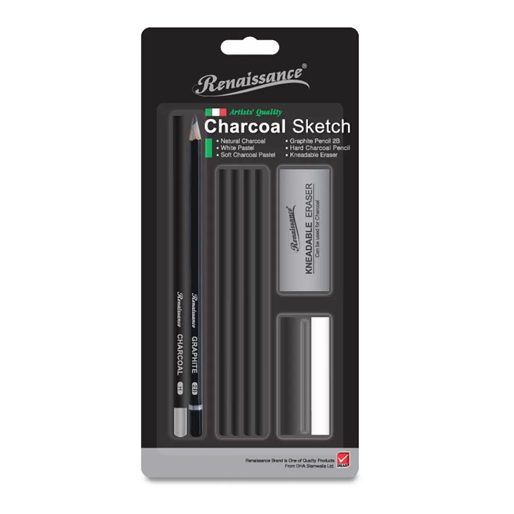 9-osainen hiilityösetti sisältää 4 piirustushiiltä, lyijykynän 2B, kovan hiilikynän, hiililiidun, valkoisen pastelliliidun sekä muotoiltavan hiilikumin.