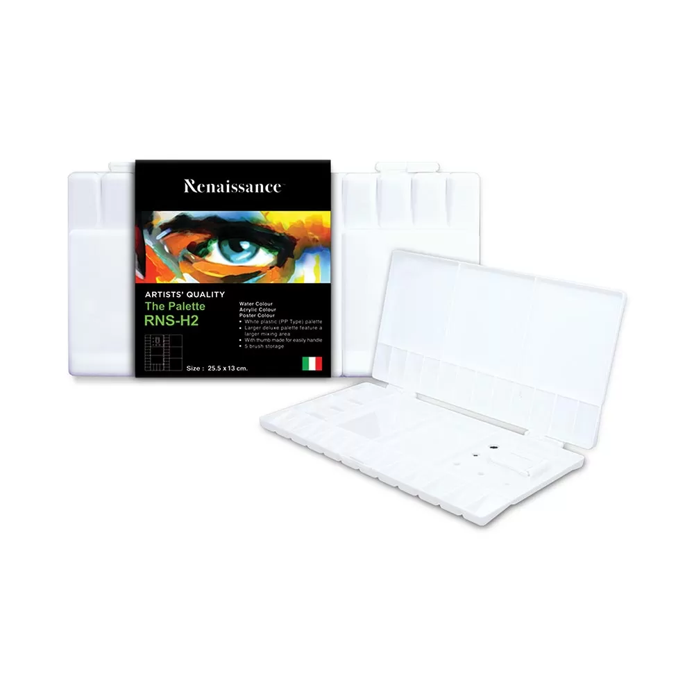 Muovinen kokoontaittuva maalauspaletti, jossa käyttöä helpottava reikä peukalolle. Koko 25,5 cm x 13 cm, monta erillistä sekoitusosoita sekä paikat viidelle siveltimelle. Helppo puhdistaa, soveltuu erityisesti akryyli-, vesi- ja guassiväreille.