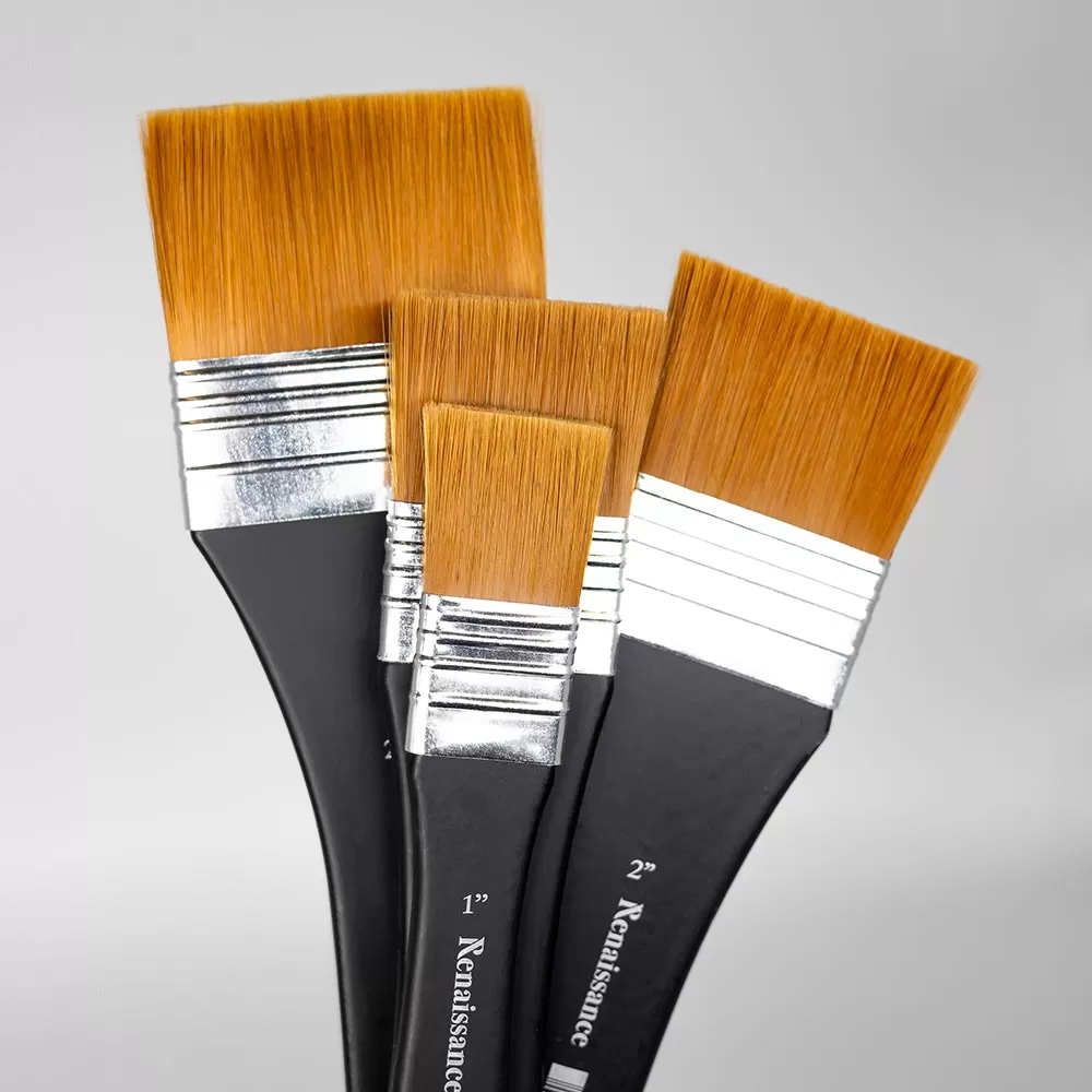 Leveät Renaissance siveltimet valmistetaan keinokuidusta. Pehmeän ja hienon karvan ansiosta sivellin imee hyvin vettä. Siveltimet sopivat erityisesti vesi- ja akryyliväreille. Leveä sivellin on hyvä apuväline laveeraamiseen ja isojen pintojen maalaamiseen.
