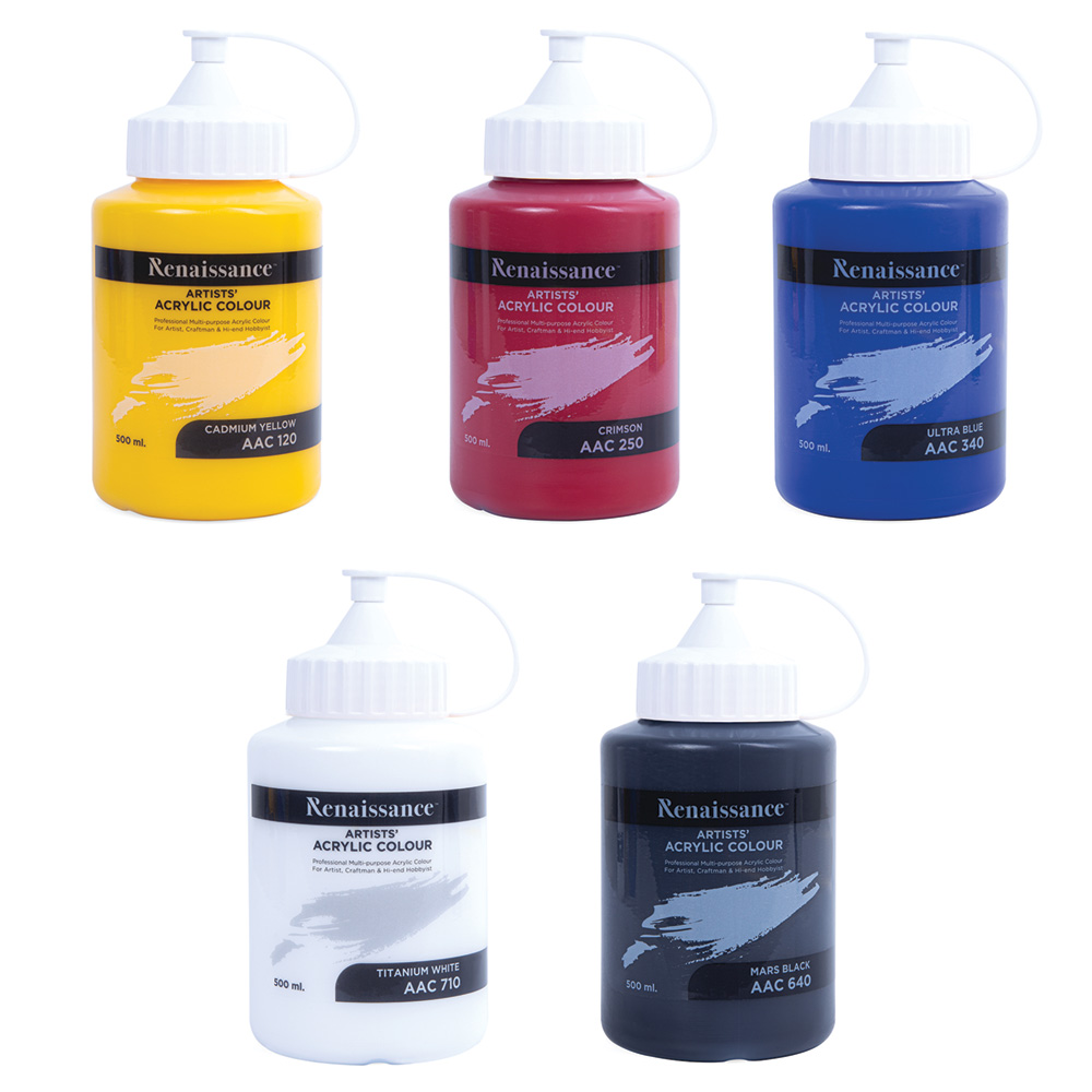 Löydät valikoimastamme isompia 250 ml yksittäisiä akryyliväripurkkeja tai erilaisia akryylivärisettejä, joissa tulee useampi sävy kerralla. Valitse siis valmiiden sävyjen joukosta tai osta perusvärit (sininen, keltainen ja punainen) ja lähde sekoittelemaan omia väriyhdistelmiä.