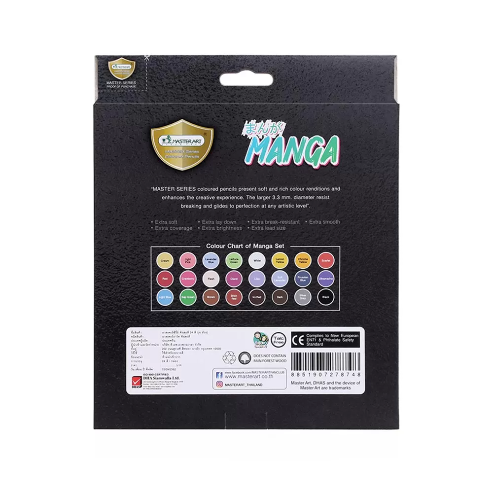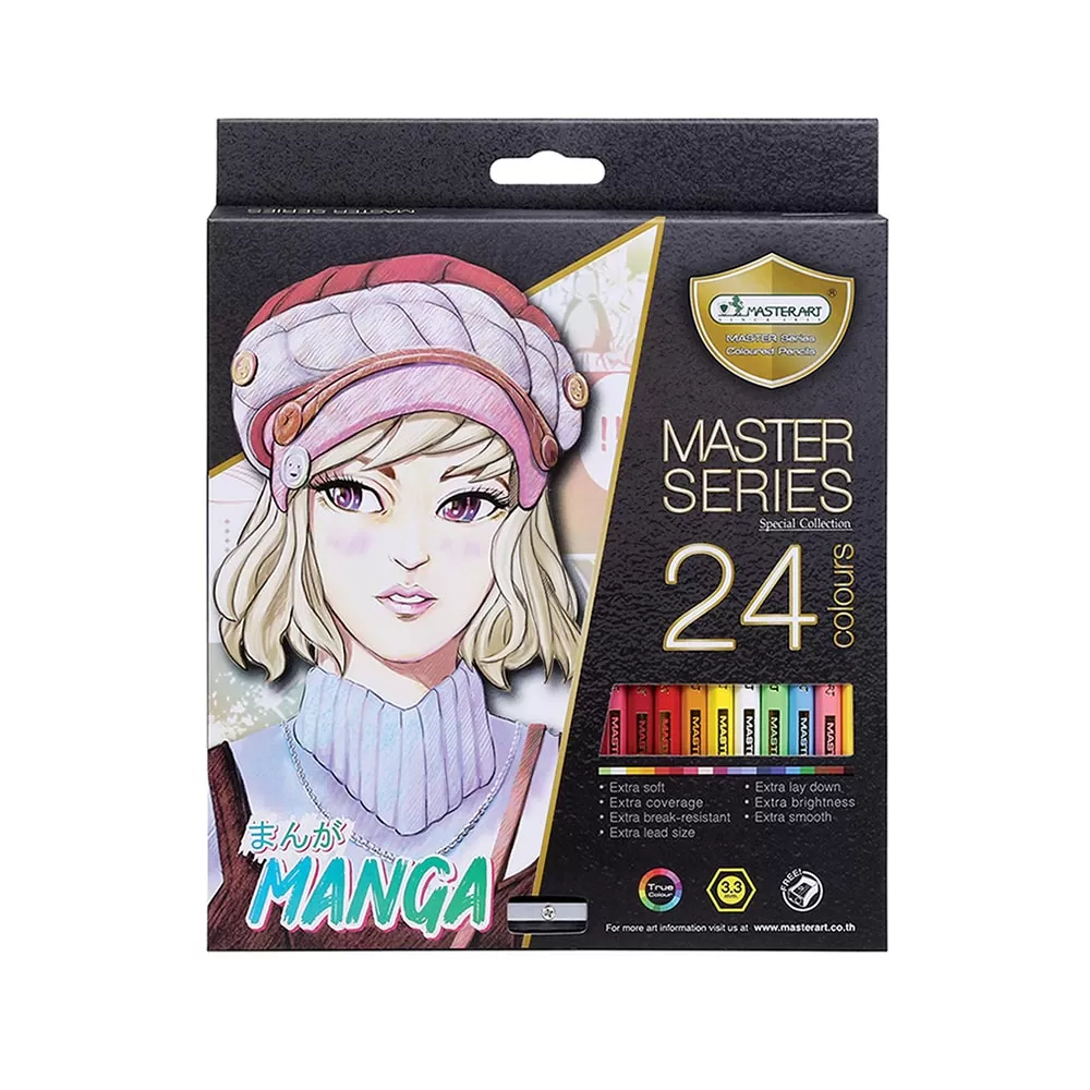 Pakkaus sisältää 24 kpl manga-sävyistä värikynää. Korkealaatuiset puuvärikynät, joissa on täyteläinen ja pehmeä pigmentti sekä hyvä valonkesto. Kirkkaat värit, jotka näkyvät myös tummalla kartongilla.